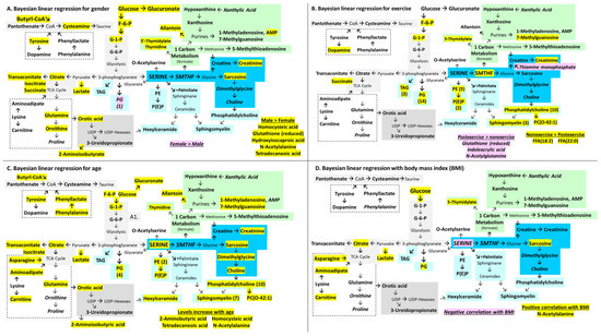 The effect of gender was evaluated by comparing the results of multivariate (Figure 2) and Bayesian linear regression (SOM Figure S1, SOM Table S1). Gender was weighted towards males as they had 49 metabolites and eight lipids with levels that were higher than females. Females had two metabolites and nine lipids. The metabolites and lipids with significant changes were pooled for pathway enrichment, and those selected were Warburg effect, gluconeogenesis, glycolysis, pentose phosphate pathway, pyrimidine metabolism, glutamate metabolism, citric acid cycle, butyrate metabolism, pantothenate, and CoA biosynthesis (SOM Figure S1).
