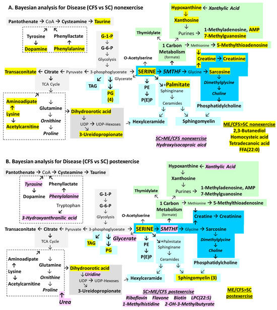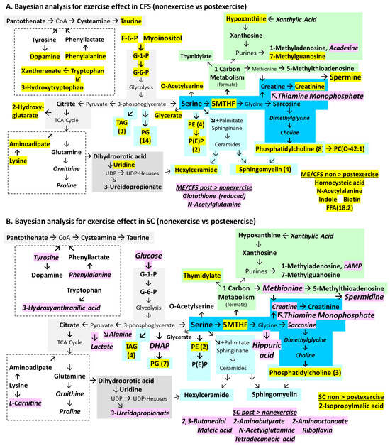 Bayesian analysis of ME/CFS vs. SC in non-exercise and post-exercise cohorts. (A) Metabolites that were significantly elevated before exercise in ME/CFS (ME/CFS > SC non-exercise) are shown in bold and highlighted in yellow. Only hydroxyisocaproic acid was higher in SC > ME/CFS (pink). (B) The post-exercise comparison of ME/CFS vs. SC found elevated serine in ME/CFS (yellow highlighting) with reciprocal lower 5MTHF and other vitamins (SC > ME/CFS post-exercise, pink italics). Modules are color-coded as in Figure 2.