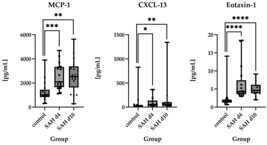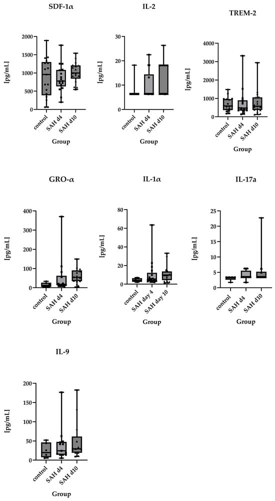 - Vlachogiannis, P.; Hillered, L.; Enblad, P.; Ronne-Engström, E. Elevated Levels of Several Chemokines in the Cerebrospinal Fluid of Patients with Subarachnoid Hemorrhage Are Associated with Worse Clinical Outcome. PLoS ONE 2023, 18, e0282424. [Google Scholar] [CrossRef]