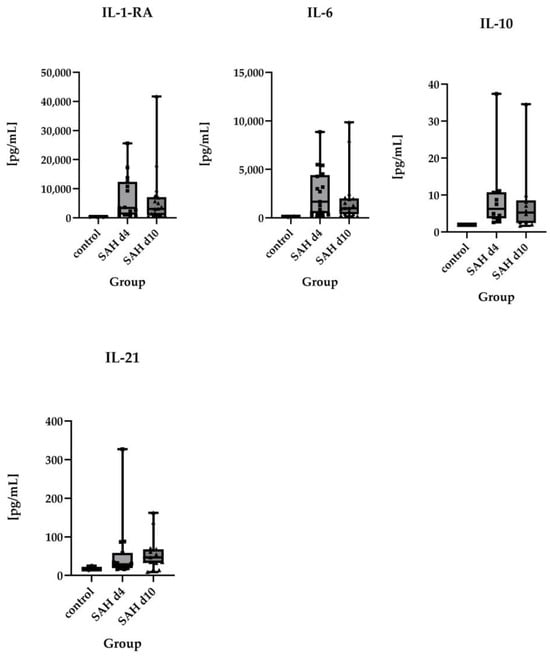 - Vlachogiannis, P.; Hillered, L.; Khalil, F.; Enblad, P.; Ronne-Engström, E. Interleukin-6 Levels in Cerebrospinal Fluid and Plasma in Patients with Severe Spontaneous Subarachnoid Hemorrhage. World Neurosurg. 2019, 122, e612–e618. [Google Scholar] [CrossRef]
