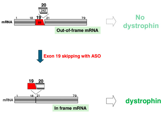 Splicing involves the precise removal of introns, and the recognition of splice sites is tightly regulated. For this reason, consensus sequences are conserved upstream of the 5′ end of the exon as the branch point and splice acceptor site and downstream of the 3′ end of the exon as the splice donor site. Furthermore, splicing enhancer or splicing silencer sequences are present within exons or introns, ensuring the functionality of these consensus sequences. In the case of Dystrophin Kobe, the deletion of a splicing enhancer sequence led to exon 19 skipping, as demonstrated through splicing assays using mini-genes [7]. At the same time, it was revealed that an ASO complementary to the deleted splicing enhancer sequence could inhibit splicing [7].