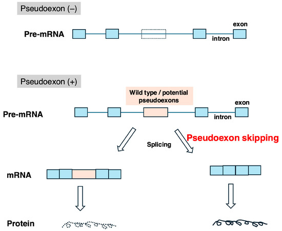 Pseudoexons and their skipping. In normal conditions, pre-mRNA is composed only of authentic exons, producing normal mRNA (pseudoexon (–)). However, due to certain genetic disease-causing variants, a pseudoexon (either a wild pseudoexon or a potential pseudoexon) can form within an intronic sequence (pseudoexon (+)). If this pseudoexon is incorporated into mRNA during splicing, protein synthesis is disrupted (left). Using an ASO to induce the skipping of the pseudoexon allows the production of completely normal mRNA and proteins (right). Blue rectangles represent normal exons, while orange rectangles indicate pseudoexons.