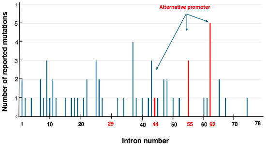 A total of 61 single-nucleotide disease-causing variants leading to pseudoexon formation in the DMD gene have been reported, based on the author’s review of the literature [58,63,64,65,66,67] (Supplementary Table S1). The distribution of these variants within the DMD gene spans introns 1 to 74 (Figure 3). While most introns contained a single disease-causing variant, introns 9, 25, 43, and 55 harbored three disease-causing variants each, and intron 62 contained five disease-causing variants, suggesting disease-causing variant clustering within specific introns. Intron 62 is home to the Dp71 promoter, one of the alternative promoters of the DMD gene, implying a potential relationship between disease-causing variant clustering and alternative promoters. Further investigation into introns 29, 44, and 55, which also contain alternative promoters, revealed three disease-causing variants in intron 55. Thus, two out of the four introns with alternative promoters showed disease-causing variant clustering, hinting at a connection between alternative promoters and the occurrence of pseudoexon-forming disease-causing variants. Future studies are expected to elucidate this relationship.