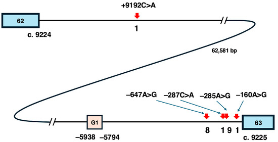 The positional relationships of these five variants within intron 62, which spans 62,581 bases, were then investigated (Figure 4). Among the five variants, c.9224+9192C>A is located furthest upstream, followed by −647A>G, c.9225–287C>A (−287C>A), −285A>G, and c.9225–160A>G. Notably, the four downstream variants are concentrated within 1000 bases between the G-promoter/exon 1 region and exon 63. Of these, −647A>G and −285A>G, reported eight and nine times respectively, are separated by only 362 bases. In contrast, −287C>A is located just two bases upstream of −285A>G and is reported only once, despite being situated between the two frequently reported variants. This suggests that the occurrence of these variants is not simply influenced by genomic structure but may be associated with specific factors at the affected base.