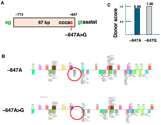 In contrast, SpliceAid2 analysis of the more frequently reported −285A>G variant revealed the loss of binding sites for splicing repressor proteins, unlike −287C>A (Figure 6B). This loss indicated that pseudoexon formation resulted from the disappearance of the splicing silencer sequence. Additionally, the donor score for −285A>G was 0.94, much higher than that for the wild-type −285A sequence. (Figure 6C). These findings suggested that pseudoexon formation due to the −285A>G variant was driven by both the loss of the splicing silencer sequence and the increased donor score, facilitating splicing.