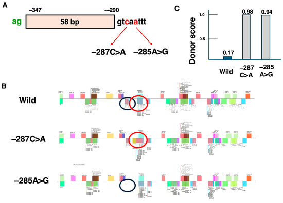 The other frequently reported variant, −285A>G, was analyzed next. Interestingly, both −285A>G and −287C>A variants shared a common pseudoexon formed by 58 bases flanked by ag and gt sequences between positions −347 and −290 in the intron (Figure 6A). Using SpliceAid2, the binding sites for splicing regulatory nuclear proteins affected by these variants were analyzed. (Figure 6B). For the −287C>A variant, a new binding site for splicing repressor nuclear proteins, absent in the wild-type −287C sequence, was added. This resulted in the creation of a splicing silencer sequence, which theoretically suppresses pseudoexon insertion. However, this finding contradicted the observed pseudoexon inclusion. Therefore, the donor score, which reflects the strength of the splice site, was calculated. For the wild-type −287C sequence, the donor score was only 0.17, whereas it significantly increased to 0.98 in −287C>A. (Figure 6C). This suggests that the formation of the pseudoexon by−287C>A was primarily due to the increased donor score.