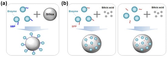 (a) Oriented enzyme immobilization on silica surface by a silica-binding peptide/protein (SBP) fusion. (b) Enzyme encapsulation within silica particles using a silica-forming peptide/protein (SFP) either in a genetically fused form (left) or in a physically mixed form (right) with the SFP.