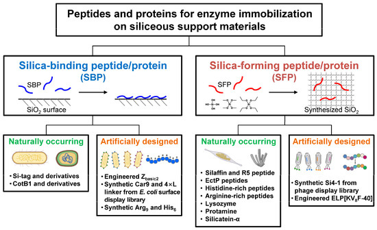 In general, though with some exceptions, both SBPs and SFPs are characterized by having a high isoelectric point (pI) value with a high content of positively charged amino acids (Lys, Arg, His). SFPs are generally considered to be SBPs, but not vice versa [12], implying that a more elaborate sequence design is required to confer silica-forming functionality. In this review, SBPs and SFPs relevant to enzyme technologies are categorized into naturally occurring and artificially engineered ones, and their distinct features, including the working mechanisms, are summarized (Figure 2). A naturally occurring protein refers to a protein or a portion of a protein with a native, unmodified stretch of amino acid sequence. Conversely, an artificially engineered protein may be a variant whose sequence has been randomly or rationally mutated from its native form, or it may be a synthetic protein with an entirely new sequence with no previously identified homologues. This review may guide us in choosing proper SBPs or SFPs for effectively immobilizing enzymes on siliceous materials.