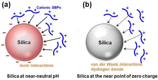 Adsorption of positively charged silica-binding peptides/proteins onto silica surface (a) primarily via ionic interactions at near-neutral pH or (b) via van der Waals interactions and hydrogen bonds at the near point of zero charge (redrawn from reference [14]).