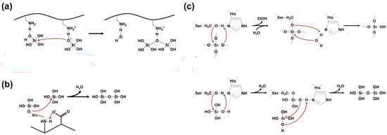 Silica polycondensation by silica-forming peptides/proteins. Red arrow indicates nucleophilic attack. (a) The formation of reactive silanolate by deprotonated amino group and the polycondensation through nucleophilic substitution reaction between silicic acid molecules (redrawn from reference [43]). (b) The charge relay effect between the amino and the carboxyl groups on adjacent amino acids promotes the activation of the lone-pair electrons on the amine nitrogen (redrawn from reference [44]). (c) The hydrolysis of silicon alkoxide (upper, redrawn from reference [45]) and the polycondensation of orthosilicic acids (lower, redrawn from reference [46]) catalyzed by silicatein-α.