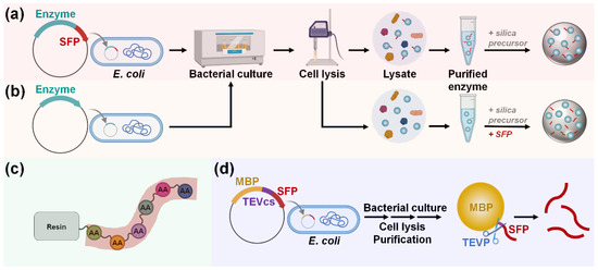 For SFP-mediated immobilization, enzymes are typically produced as fusion proteins tagged with an SFP (Figure 6a). In contrast to SBP-mediated immobilization, SFP-fused enzymes must be purified before immobilization. This is because SFP-mediated encapsulation is non-selective and requires a high concentration of SFP for efficient immobilization, making the use of cell lysate unsuitable. One-step enzyme encapsulation, which occurs simultaneously with silica synthesis, is then performed by mixing the purified enzyme solution with the silica precursors under ambient aqueous conditions. Non-recombinant enzymes or recombinant enzymes without an SFP can also be immobilized using the coprecipitation method, where enzymes are blended with separately prepared SFPs (Figure 6b). Most studies have utilized chemical peptide synthesis for the preparation of SFPs (Figure 6c). However, a recent study introduced a recombinant production method for SFPs, offering a more environmentally friendly and cost-effective approach [62]. In this method, maltose-binding protein (MBP)–SFP fusion protein, along with a flanked tobacco etch virus (TEV) cleavage site, is constructed and expressed, allowing for the SFPs to be obtained separately following treatment with TEV protease (Figure 6d). The genetic fusion of an SFP to a target enzyme provides benefits over the coprecipitation method as the peptide can be easily produced alongside the enzyme at a low cost, and a higher immobilization yield can be attained, particularly when the concentration of the SFP-fused enzyme is high [63].