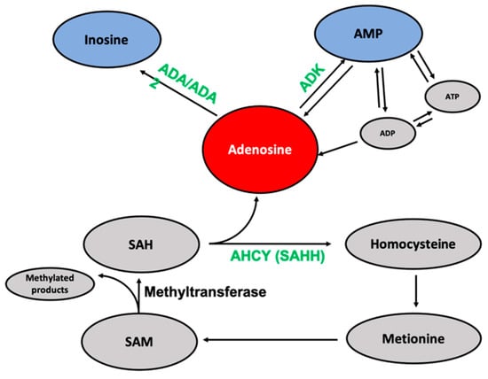 Adenosine is one of the basic nucleosides present both intra- and extracellularly, which exhibit an anticancer and antioxidant activity [,,,] and may act as a regulator of the immune system []. The activity of adenosine in cells is mainly related to its interaction with specific cellular targets such as adenosine kinase (ADK) and adenosine deaminases (ADA and ADA2), which convert it into AMP and inosine, respectively (Figure 1). As a precursor of ATP, adenosine plays a crucial role in ATP-dependent signaling pathways [] and RNA synthesis [].