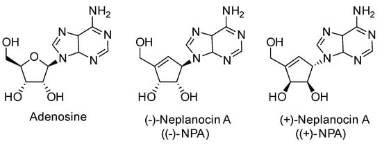 Due to the wide range of adenosine activity, its derivatives have garnered significant interest as potential therapeutic agents. Adenosine analogues have been explored for a variety of biomedical applications [,], including antiproliferative [] and antioxidant [] treatments. This class of compounds is being tested as inhibitors of adenosine-binding enzymes [], ligands for adenosine receptors [,,], or precursors for modified ATP generation and further synthesis of therapeutic RNA []. Neplanocin A (9-[trans-2,trans-3-dihydroxy-4-(hydroxymethyl)cyclopent-4-enyl]adenine, NPA), a member of the carbocyclic nucleoside family, is a natural analogue of adenosine where the traditional sugar moiety is replaced by a carbocyclic unit (Figure 2).