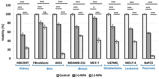 The viability of selected cell types after 48 h of incubation with 100 μM (+)-NPA and (-)-NPA. Viability values were calculated based on the MTT assay. Results for the cells treated with 100 μM (+)-NPA or (-)-NPA were calculated relative to the control samples (untreated cells) taken as 100%. All data are expressed as the mean of at least three independent experiments performed in triplicate ± SE. Statistical significance was determined using Student’s t-test; * p < 0.05, *** p < 0.0001, ns—not significant.