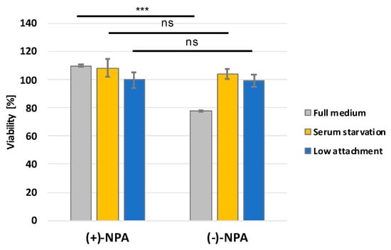 The influence of neplanocin A enantiomers on the viability of MDA-MB-231 cells under different cell culture conditions. MDA-MB-231 cells were incubated for 24 h with 10 μM (+)-NPA or (-)-NPA on ultra-low attachment (blue bar) or standard plates under serum-free (yellow bars) or full medium (grey bars) conditions. Each value represents the mean viability of cells treated with the respective NPA enantiomer ((+)-NPA or (-)-NPA) calculated relative to untreated cells cultured under the same conditions (taken as 100%). Statistical significance was determined using Student’s t-test; *** p < 0.0001, ns—not significant.
