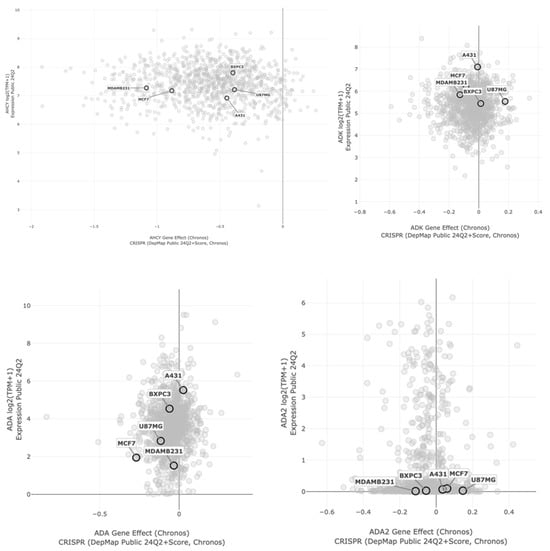 The correlation between gene expression and gene effect in the selected cell lines was performed based on the DepMap portal (http://depmap.org/portal) [] using data version Expression Public 24Q2 and CRISPR (DepMap Public 24Q2+Score, Chronos). Chronos was used as an algorithm for inferring gene fitness effects from CRISPR knockout experiments []. The following genes were analyzed: AHCY, ADK, ADA, and ADA2.