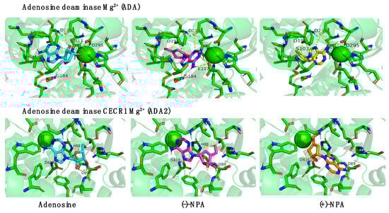 The molecular docking results of (-)-NPA and (+)-NPA interaction in the active center of adenosine deaminases (ADA and ADA2) using Mg2+ ions. The numbers of amino acids were assigned with the FASTA sequence of protein taken from the UniProt database as a base template.