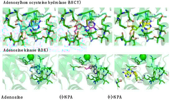 The molecular docking results of (-)-NPA and (+)-NPA interaction in the active center of S-adenosylhomocysteine hydrolase (AHCY) and adenosine kinase (ADK) compared to the adenosine. The numbers of amino acids were assigned with the FASTA sequence of the protein from the UniProt database.
