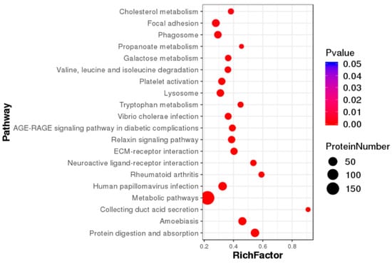 Through the analysis of differential proteins, it was found that they were mainly enriched in metabolic pathways, protein digestion and absorption, lysosome, propionic acid metabolism, galactose metabolism, valine, leucine and isoleucine degradation, phagosome, tryptophan metabolism and other pathways. Among them, 197 differentially expressed proteins were enriched in metabolic pathways, 41 differentially expressed proteins were enriched in protein digestion and absorption pathways, 34 differentially expressed proteins were enriched in protein processing pathways in endoplasmic reticulum, 27 differentially expressed proteins were enriched in lysosomal pathways, and 24 differentially expressed proteins were enriched in PI3K-Akt pathway. A total of 24 differentially expressed proteins were enriched in the oxidative phosphorylation pathway (Figure 2).