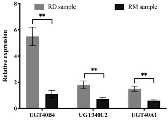Transcript level validation of UGT40B4 (AEW43167.1), UGT340C2 (AEW43159.1) and UGT40A1 (AEW43163.1). Mean and standard deviation were used for evaluation, the sample size was three (** p < 0.01; two-tailed t-test).