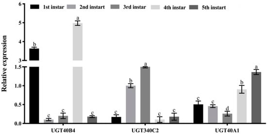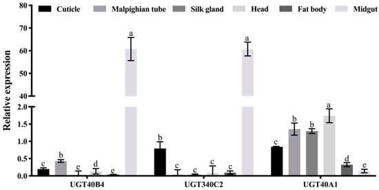 Through the analysis of the instar expression profile and tissue expression profile of the three UGT genes, it was found that in the instar expression profile, the relative expression of UGT40B4 gene was higher in the 1st and 4th instars of the silkworm (Figure 4). The relative expression level of UGT340C2 gene gradually increased from the 1st to 3rd instars of the silkworm, and the relative expression levels of the 2nd and 3rd instars were significantly higher, and the relative expression levels of the 4th to 5th instars were lower. The relative expression of UGT40A1 gene was low in the 1st to 3rd instars and high in the 4th to 5th instars, indicating that the gene was mainly expressed in the large silkworm period (Figure 4).