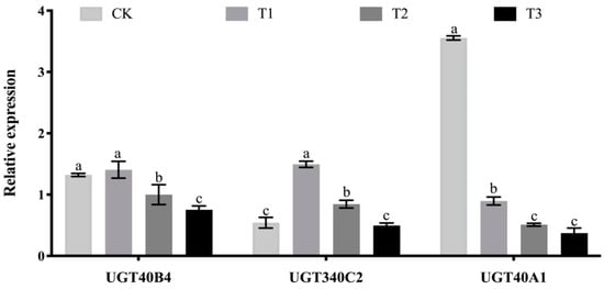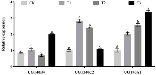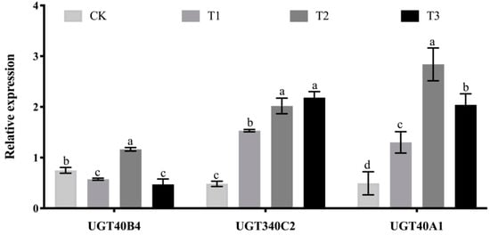 UGT gene expression spectrum. Data represent three biological repetitive mean +/− standard deviation, according to Duncan’s multiple range test, to list the different letter’s mean significant difference (p < 0.05).