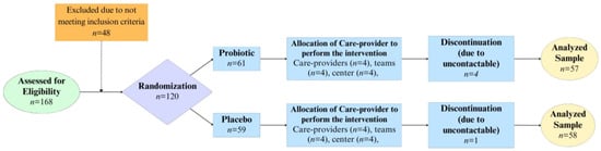 As shown in Figure 1, 120 (71.43%) children from 168 screened potential participants were eligible to be included in the study, whereas 48 were excluded as they did not meet the inclusion criteria. Five subjects were lost to the study due to being uncontactable during the study period of 4 weeks. The final trial consisted of 57 and 58 children in the probiotic and placebo group, respectively, yielding a total of 115 children with a gender ratio (male to female) of 1.17. No adverse effects were reported throughout the study and no subjects dropped out due to any complications.