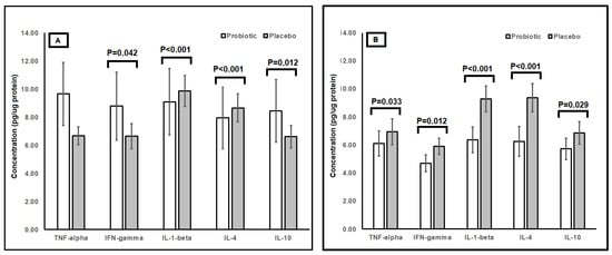 Concentrations of inflammatory proteins as obtained from oral swab samples of children (n = 115) randomly assigned to a double-blind administration of 4 weeks with either placebo (n = 58; grey) or probiotic B. longum subsp. infantis B8762 (n = 57; white). Results are expressed as means; error bars (SEM). (A) Comparison of inflammatory protein between probiotic and placebo taken at week 0. (B) Comparison of inflammatory protein between probiotic and placebo taken at week 4.