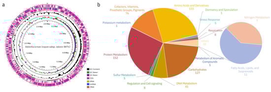(a) Circular map of whole genome of Bifidobacterium longum subsp. infantis B8762. From the innermost to the outermost circle, the first circle represents the genome size. The second and third circles illustrate the GC skew values, calculated using the formula G − C/G + C, which help identify the leading and lagging strands; typically, the leading strand has a GC skew > 0, and the lagging strand has a GC skew < 0. These circles also assist in pinpointing the replication origin (minimum cumulative offset) and the replication terminus (maximum cumulative offset), particularly important for circular genomes. The fourth circle, in black, represents the GC content: regions with higher GC content than the genome average is shown outward, while regions with lower GC content are shown inward, with higher peaks indicating greater deviations from the average GC content. The outermost two layers display the CDSs (coding sequences) on the positive and negative strands, with different colors representing distinct COG functional categories. (b) Functional annotation information of B8762. Functional classification of B8762 genome representing the distribution of genes based on their annotations to terms in RAST.