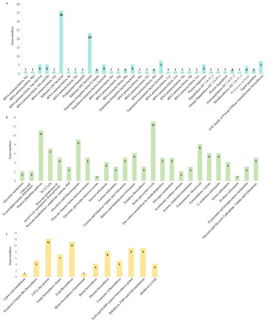 The gene numbers of protein metabolism (a), carbohydrate metabolism (b), and microbial metabolism (c) in Bifidobacterium longum subsp. infantis B8762.
