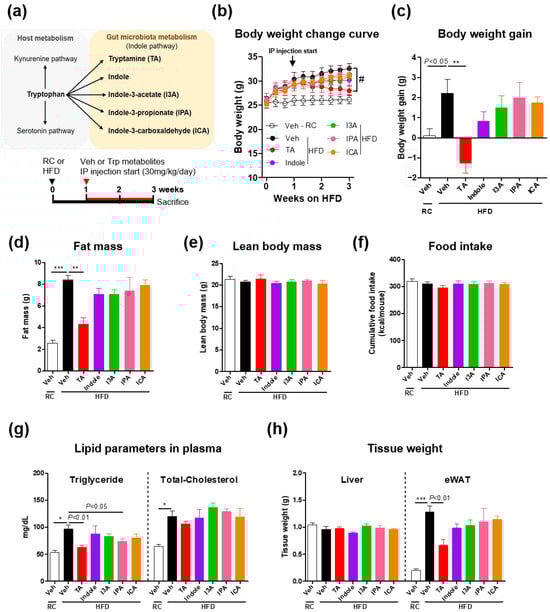 APA StyleLee, J., Jang, H.-R., Lee, D., Lee, Y., & Lee, H.-Y. (2025). Gut Bacteria-Derived Tryptamine Ameliorates Diet-Induced Obesity and Insulin Resistance in Mice. International Journal of Molecular Sciences, 26(3), 1327. https://doi.org/10.3390/ijms26031327