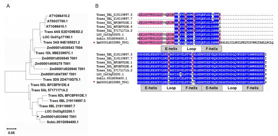 Bioinformatics analysis of ZmCML3. (A) Phylogenetic tree of ZmCML3 homologous genes with other plant species. (B) The multi-sequence alignment of ZmCML3 orthologous proteins. The different background colors represent the similar degree of amino acid sequences. Blue: the similar degree of amino acid sequences is greater than or equal 75%. Pink: the similar degree of amino acid sequences is less than 75% and greater than or equal 50%. Gray: the similar degree of amino acid sequences is less than 50%. The red dots: Mark ZmCML3 (Zm00001d033980).
