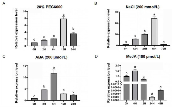 The expression levels of ZmCML3 in maize under different treatments, including (A) PEG6000 (20%), (B) NaCl (200 mmol/L), (C) ABA (200 µmol/L), and (D) MeJA (100 µmol/L). The experiments were performed with three biological replicates. ZmTub (GRMZM2G066191) was used as an endogenous reference for data standardization. The significance difference was analyzed using one-way ANOVA according to letter marking method. The different letters indicate significant differences at p < 0.05.