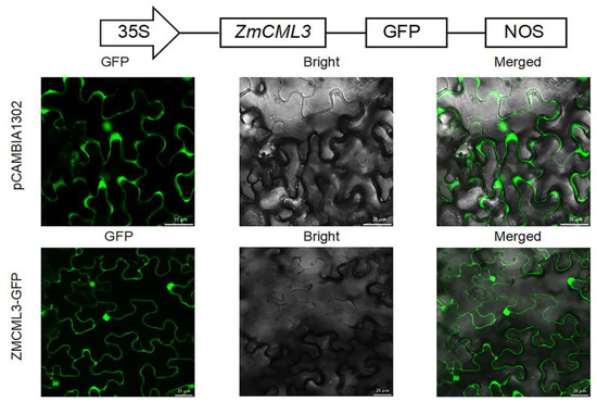 The CDS of ZmCML3 was cloned into the GFP-expressing vector pCAMBIA1302 (BgL II and Spe I sites) to construct the ZmCML3-GFP fusion plasmid. The pCAMBIA1302 and ZmCML3-GFP plasmids were transferred into EHA105 Agrobacterium, respectively. The recombinant plasmid was transformed into N. benthamiana leaves using Agrobacterium-mediated method. The N. benthamiana leaves were cultured in the dark at room temperature for 72 h and observed via a confocal laser scanning microscope (Leica, Frankfurt, Germany). The primers are listed in Table S2.