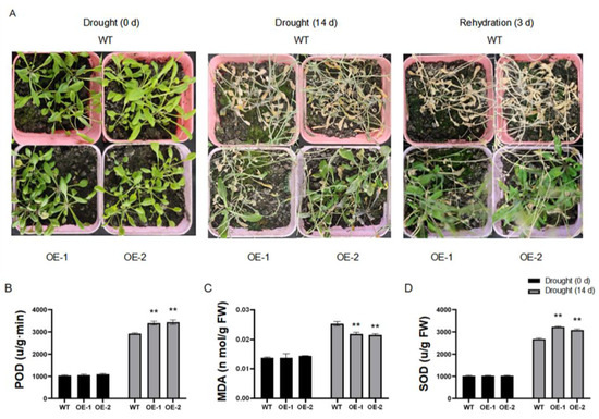 To further explore the function of ZmCML3, T3 generation transgenic Arabidopsis were obtained and two ZmCML3 overexpressing Arabidopsis lines with the highest expression levels (OE1 and OE2) were used to perform a drought stress assay (Figure S1). The ZmCML3 overexpressing and wide type (WT) lines were subjected to drought stress treatment by limiting water for 14 d and rehydration for 3 d. As shown in Figure 4A, there were no differences between WT and ZmCML3 overexpressing lines at 0 d. However, after drought stress treatment for 14 d, the leaves of WT lines showed more severe wilting than those of ZmCML3 overexpressing lines. After rehydration for 3 d, the growth of ZmCML3 overexpressing lines was significantly better than that of WT lines. In order to determine the physiological function of ZmCML3 in response to drought stress, we further measured related physiological parameters. The results showed that there is no significant difference between ZmCML3 overexpressing lines and WT lines in malondialdehyde (MDA) content and the activity of superoxide dismutase (SOD) and peroxidase (POD) at 0 d. After drought stress treatment for 14 d, the MDA content of ZmCML3 overexpressing lines was significantly lower than that of WT lines, and the activity of SOD and POD in ZmCML3 overexpressing lines were significantly higher than that of WT lines (Figure 4B–D).