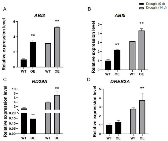 Relative expression levels of drought-stress-responsive genes in ZmCML3 overexpressing lines and WT lines after drought stress treatment for 14 d. (A) ABI3. (B) ABI5. (C) RD29A. (D) DREB2A. The experiments were performed with three biological replicates. The data were the average (±SD) of three independent experiments. ACTIN2 (At3g18780) was used as an endogenous reference for data standardization. Two-way ANOVA was used to perform significance analysis (** p < 0.01).