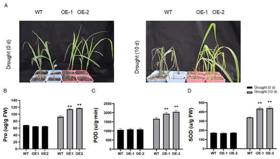 Overexpression of ZmCML3 enhances the drought tolerance of maize. (A) The phenotype of ZmCML3 overexpressing lines and WT lines after drought stress treatment for 10 d. Physiological indexes in the ZmCML3 overexpressing and WT lines after drought stress treatment for 10 d. (B) Pro content, (C) POD activity, (D) SOD activity. The experiments were performed with three biological replicates. The data were the average (±SD) of three independent experiments. Two-way ANOVA was used to perform significance analysis (** p < 0.01). For drought stress assay, each biological replicate has no less than 10 plants.