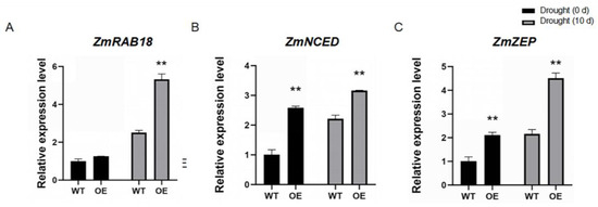 In addition, we also analyzed the expression levels of drought-stress-responsive genes ZmRAB18 (GRMZM2G098750), ZmNCED (GRMZM5G838285), ZmZEP (GRMZM2G379053), which were involved in maize drought stress response [41]. After drought stress treatment for 10 d, the expression levels of these genes in ZmCML3 overexpressed lines were significantly higher than those in the WT lines (Figure 7). These results indicated that the ZmCML3 gene can positively regulate the drought tolerance in maize through increasing the antioxidant enzyme activity and the expression of drought-stress-responsive genes.