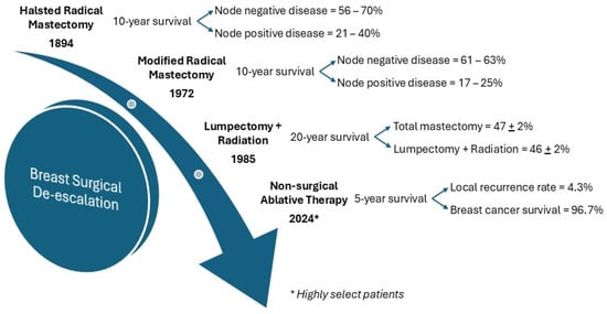 Surgical treatment for breast cancer originated with extensive, aggressive procedures like the Halsted radical mastectomy where not only was all breast tissue removed but also the nipple–areola complex, pectoralis major and minor muscles, and level I-III axillary nodes []. This aggressive approach was questioned by Madden, who proposed significant modifications through conservation of chest-wall muscles [], which was later reported to be equally effective in terms of survival []. However, as advancements in imaging and the effectiveness of chemo-endocrine and radiation therapies increased, the need for such drastic surgical treatment was called into question. The NSABP B-06 trial initiated in the 1970s served as a pivotal study first reported in 1985 [] that moved the paradigm towards treatment de-escalation by establishing that lumpectomy followed by radiation therapy in women with early-stage breast cancer was just as effective as mastectomy, ushering in the era of breast-conservation treatments well established by long-term follow-up [,].