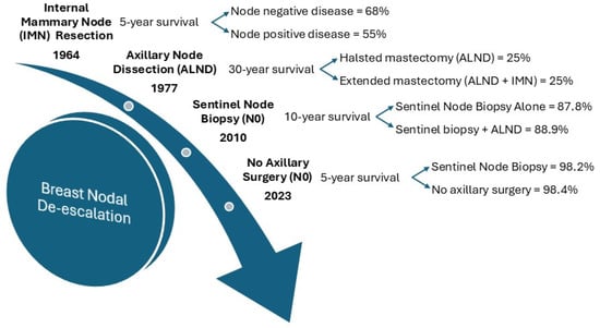 The American College of Surgeons Oncology Group Z0011 (ACOSOG Z0011) trial found patients with early-stage, clinically node-negative invasive primary breast cancer can forgo the more invasive axillary lymph node dissection for a sentinel lymph node dissection with whole-breast irradiation and adjuvant systemic therapy with similar survival outcomes in patients with 1–2 positive nodes []. This finding aligned with that of the International Breast Cancer Study Group Trial (IBCSG) 23–01 randomized control trial []. Alongside this, the After Mapping of the Axilla: Radiotherapy for Surgery (AMAROS) trial found noninferiority in axillary radiation therapy over axillary lymph node dissection in early-stage invasive breast cancer with 1–2 positive sentinel lymph nodes [,]. These trials collectively support the de-escalation of axillary lymph node dissection for sentinel lymph node biopsies with adjuvant radiation, further promoting de-escalation.