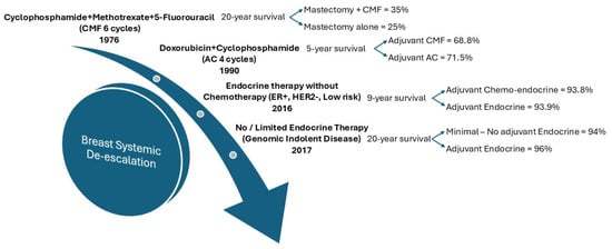 Breast cancer therapy de-escalation treatment marks a transformation in oncology, focusing on lowering treatment intensity while still achieving effective outcomes for patients. Initially, radical mastectomy was the standard surgical approach, driven by the belief that aggressive removal of breast tissue and surrounding lymph nodes would improve survival rates. However, landmark trials such as the National Surgical Adjuvant Breast and Bowel Project (NSABP) B-06 trial initiated in the 1970s demonstrated that lumpectomy followed by radiation could provide equivalent outcomes, paving the way for more conservative surgical options [,]. This shift marked the beginning of de-escalation in surgical practices, as clinicians increasingly recognized that less invasive techniques could maintain efficacy while enhancing patients’ quality of life.