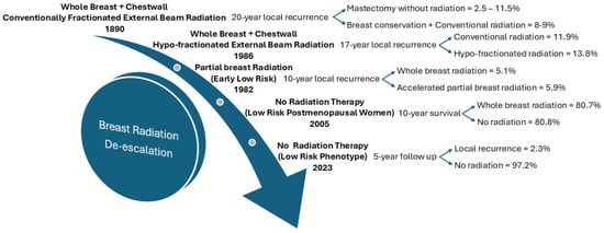 Timeline depiction of de-escalation for radiation therapy in breast cancer.