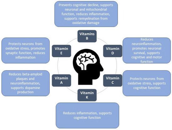 B vitamins, mainly B1 (thiamine), B2 (riboflavin), B3 (niacin), B6 (pyridoxine), B7 (biotin), B9 (folate), and B12 (cobalamin), play essential roles in maintaining brain health and preventing neurodegenerative diseases [8,10]. They support key metabolic processes such as DNA synthesis, nerve function, and the regulation of homocysteine levels as a risk factor for neurodegenerative disorders.
