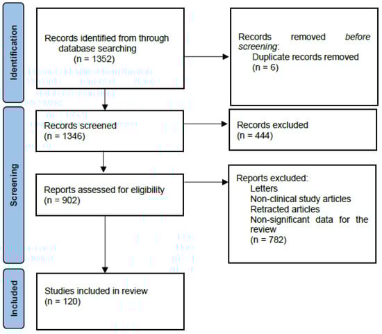 We performed a comprehensive literature search in the MEDLAB/PubMed electronic database for the last 5 years using the keywords “vitamins and neurodegenerative diseases” (n = 1352). The next step involved choosing vitamins essential for the review. Additionally, we used keywords related to specific neurodegenerative diseases: “Alzheimer’s Disease and vitamins” (n = 977), “Parkinson’s Disease and vitamins” (n = 539), “Amyotrophic Lateral Sclerosis and vitamins” (n = 104), “Multiple Sclerosis and vitamins” (n = 688), “Vitamins B and neurodegenerative diseases” (n = 236), “Vitamin C and neurodegenerative diseases” (n = 87), “Vitamin D and neurodegenerative diseases” (n = 228), “Vitamin E and neurodegenerative diseases” (n = 90), “Vitamin A and neurodegenerative diseases” (n = 72), and “Vitamin K and neurodegenerative diseases” (n = 20). Only full-text publications in English limited to studies on humans were selected. In the next step, letters, non-clinical study articles, retracted articles, and non-significant data for the review were excluded (Figure 2).