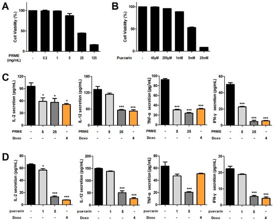 We investigated the cell viability of PRME extract and its main active ingredient, puerarin, on HeLa cells using the MTT assay. We confirmed that cell viability decreased as the dose of PRME extract and puerarin increased. Thus, the administration of PRME extract for 24 h resulted in cell viability of 87.44% at 5 mg/mL and 44.73% at 25 mg/mL (Figure 2A). In addition, the administration of puerarin for 24 h resulted in cell viability of 87.89% at 1 mM and 49.22% at 5 mM (Figure 2B). After setting the treatment concentrations of PRME extract and puerarin based on the cell viability results, we examined the effects of PRME extract and puerarin on inflammatory cytokine levels in HeLa cells. We established that cytokine levels comprising IL-2, IL-12, IFN-γ, and TNF-α were all reduced in HeLa cells treated with the PRME extract or puerarin, and in particular, a significant decrease was observed at high concentrations of PRME extract and puerarin (Figure 2C,D).