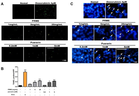 To examine the apoptotic activity of the PRME extract and puerarin, we treated HeLa cells with samples at different concentrations and analyzed them using TUNEL and Hoechst 33,342 apoptosis detection kits. Apoptotic HeLa cells showed round and condensed cell bodies, as indicated by white arrows. As shown in Figure 3, apoptosis increased with increasing concentrations of both PRME extract and puerarin in HeLa cells, suggesting that apoptosis induced by PRME extract and puerarin contributed to the decrease in the cell viability of HeLa cells.