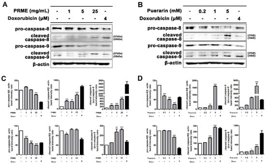 To confirm the apoptotic mechanism of the PRME extract or puerarin treatment in HeLa cells, the expression of apoptosis-related proteins was examined by western blotting. Figure 4 shows the effects of PRME and puerarin on caspase-8 and caspase-9, which are involved in the extrinsic and intrinsic apoptotic pathways, respectively. The protein expression of pro-caspase-8 and pro-caspase-9 was dose-dependently decreased by PRME and puerarin treatment in HeLa cells, whereas that of the cleaved versions of caspase-8 and -9 increased. These results imply that the PRME extract and puerarin play an important role in inducing apoptosis in HeLa cells by activating apoptosis-related genes, supporting their potential as anticancer drugs.