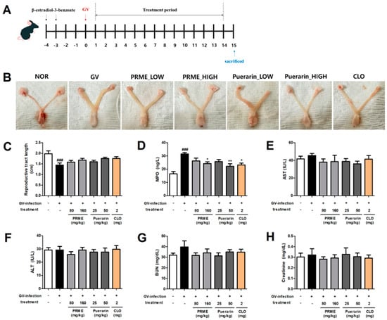 Effect of the PRME extract and puerarin on vaginitis symptoms, MPO activity, and serum levels in GV-infected mice. (A) Experimental design for the GV-infected vaginitis mice model. (B) Representative photographs of lesions of the reproductive tract (vagina and uterine horn) in mice from each group. (C) Total length of the reproductive tract. (D) MPO activity in vaginal tissue. (E–H) Serum levels of aspartate aminotransferase (AST), alanine aminotransferase (ALT), blood urinary nitrogen (BUN), and creatinine. Data are the mean ± SEM of the three experiments. ### p < 0.001 versus the normal group; * p < 0.05 and ** p < 0.01 versus the GV-infected group.