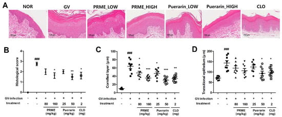 To confirm the effects of PRME and puerarin in GV-infected mice, histopathological changes in the vaginal tissues were analyzed. The vaginal tissues of mice were excised, and the isolated vaginal tissues were fixed with 4% paraformaldehyde for 24 h and then cut into 4-μm-thick sections. Tissue sections were stained with hematoxylin for 1 min and eosin for 3 min (H&E) and visualized using a digital scanner for histological analysis. The vaginal epithelial thickness was measured randomly at five sites per tissue under a ×200 magnification light microscope equipped with a camera (Olympus CX21). The severity of vaginal epithelial lesion exfoliation and inflammation was quantified by scoring from 0 to 3 according to previous criteria (0 none, 1; minimal, 2; moderate, 3; very robust) [].