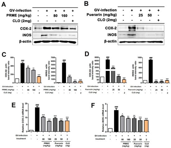 COX-2 and iNOS, which play an important role in mediating inflammatory responses and regulating cytokine levels, are expressed more when inflammatory responses occur due to external stimuli. Western blotting analysis was conducted to investigate whether COX-2 and iNOS are involved in the anti-inflammatory mechanism of PRME extract and puerarin in GV-infected mice. We found that the protein expression of COX-2 and iNOS was upregulated following GV infection. However, the increased protein expression of COX-2 and iNOS was effectively downregulated by the oral administration of the PRME extract or puerarin (Figure 7A–D). Similarly, the increased mRNA expression of COX-2 and iNOS in the vaginal tissues of GV-infected mice was significantly inhibited in a dose-dependent manner by the oral administration of the PRME extract or puerarin (Figure 7E,F). These results suggest that inflammation is suppressed by treatment with PRME extract or puerarin in GV-infected mice.